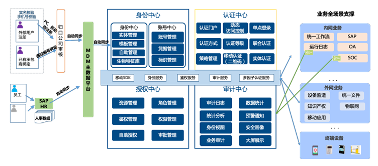通过MDM获取基础身份,集合管理身份信息,实现平台开放的身份管理和服务能力。 支撑Web应用、桌面、移动、设备终端、应用、服务的认证接入 。在应用层提供安全、便捷、高效的统一身份认证与授权审计等核心能力,实现企业全平台架构支撑能力。