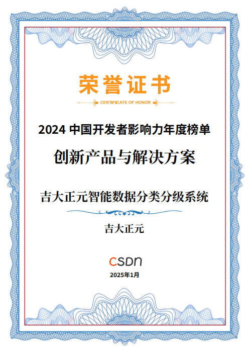 近日,中国最大的IT社区和服务平台CSDN发布了备受瞩目的《2024中国开发者影响力年度榜单》。在众多参选项目中,吉大正元智能数据分类分级系统凭借其在智能AI领域的创新技术探索和场景应用实践脱颖而出,荣获年度创新产品与解决方案奖。这一荣誉不仅彰显了吉大正元在智能AI领域的优秀成绩,也标志着其在行业内获得了开发者、技术专家、技术社区和机构对技术实力、产品创新能力和创新成果的高度认可和肯定。