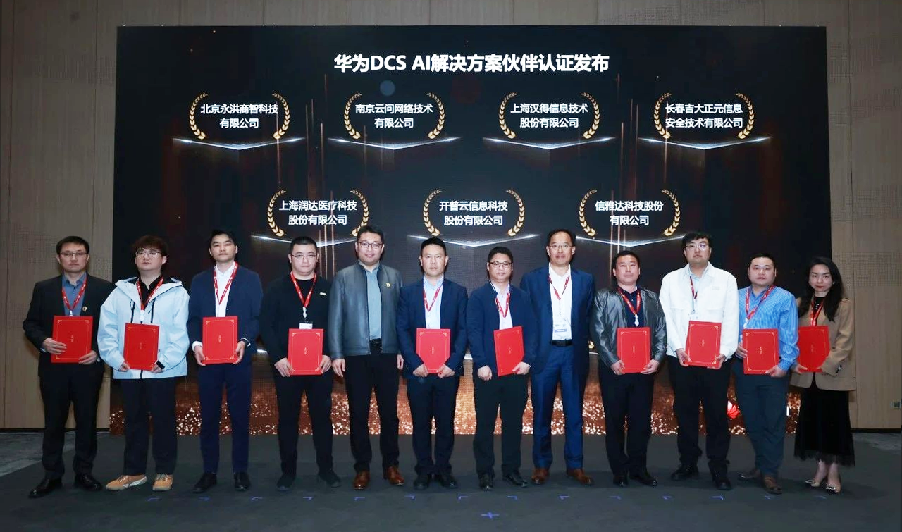 在“数据觉醒,先进数据存力构筑AI时代根基”分论坛中,基于“华为技术认证计划”,华为DCS领域总裁张伟力、中国政企解决方案副总裁董伟嗣向10家企业颁发了“华为DCS AI解决方案伙伴认证”证书。吉大正元凭借在数据存储与AI领域的突出贡献获此殊荣。