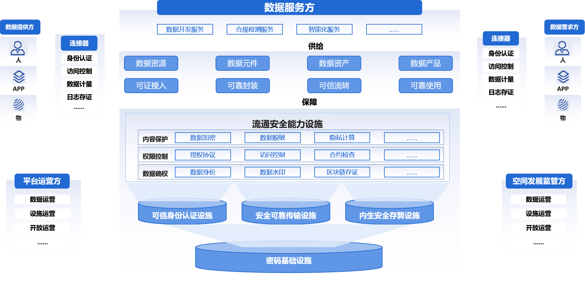 吉大正元可信数据空间建设方案以“可信+安全”为原点,以密码为特色,以“密码基础设施”、“可信身份认证设施”、“安全可靠传输设施”、“内生安全存算设施”、“流通安全能力设施”五大设施为基础,使数据空间具备计算、存储、流转、安全原生能力,满足空间各参与方的可信交互需求,构建数据要素可信流通体系,助力数据价值释放。