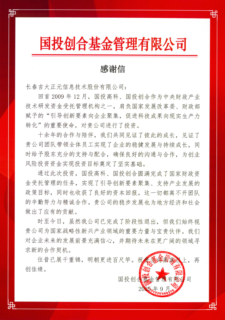 近日,国投创合基金管理有限公司向长春吉大正元信息技术股份有限公司(简称:吉大正元,股票代码:003029)发来感谢信,回顾双方合作历程,对吉大正元十余年来的稳健发展、对股东的支持与配合以及为国家战略性新兴产业所作出的贡献表示高度认可。