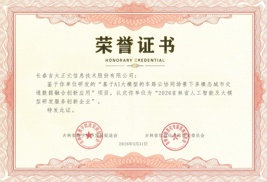 2026年3月31日,在长春召开的2026第五届吉林省数字经济发展促进大会暨第三届吉林省人工智能大会上,长春吉大正元信息技术股份有限公司(简称:吉大正元 股票代码:003029)凭借“基于AI大模型的车路云协同场景下多模态城市交通数据融合创新应用”,荣获 “2026吉林省人工智能及大模型研发服务创新企业” 及 “2026吉林省人工智能及大模型服务卓越案例” 殊荣。同时,昆仑大模型护栏、公安大模型算力一体机两大创新成果,双双入选2026 吉林省人工智能及大模型服务典型案例,成为本次大会中技术实力与落地能力双突出的标杆企业。