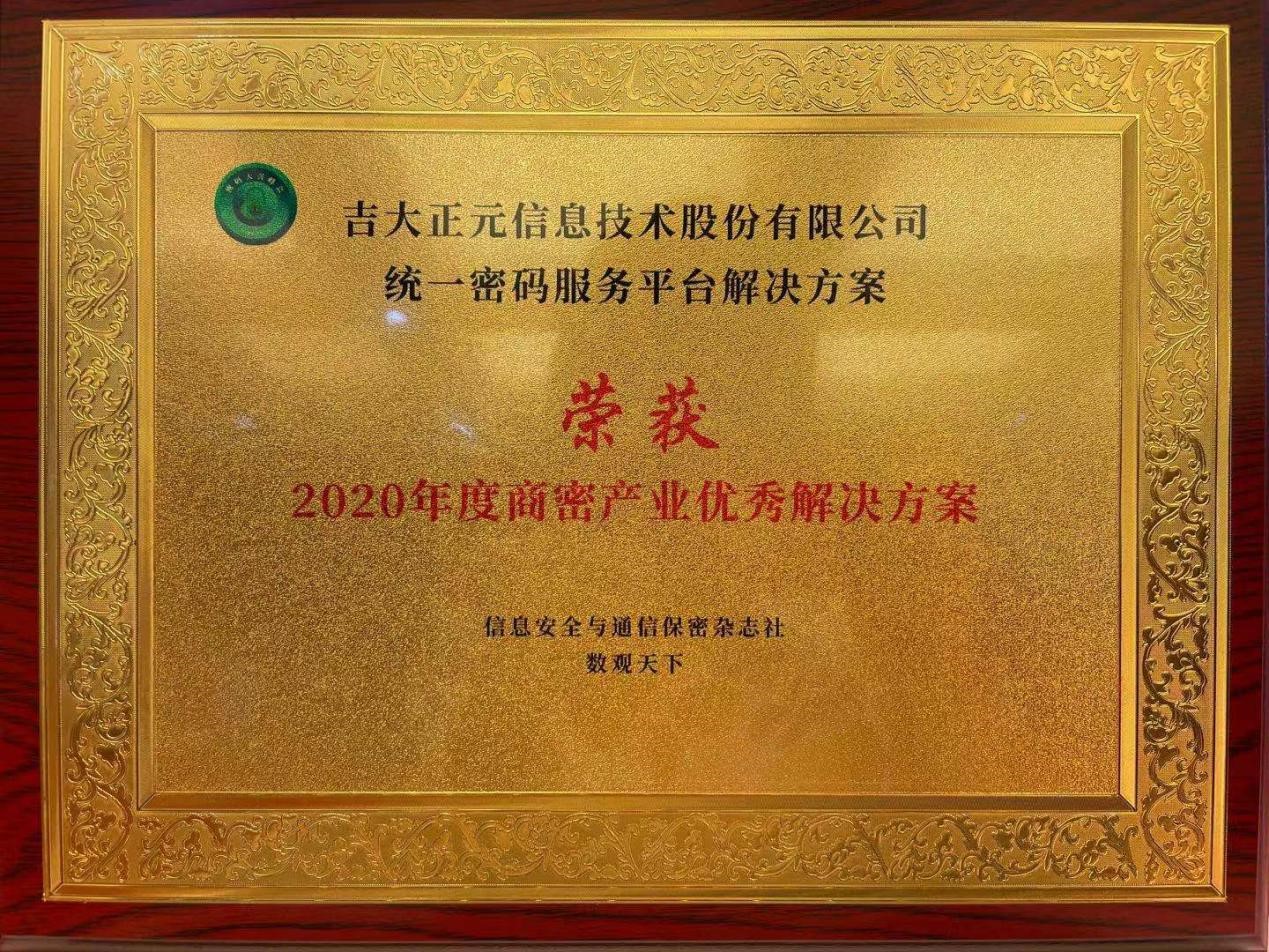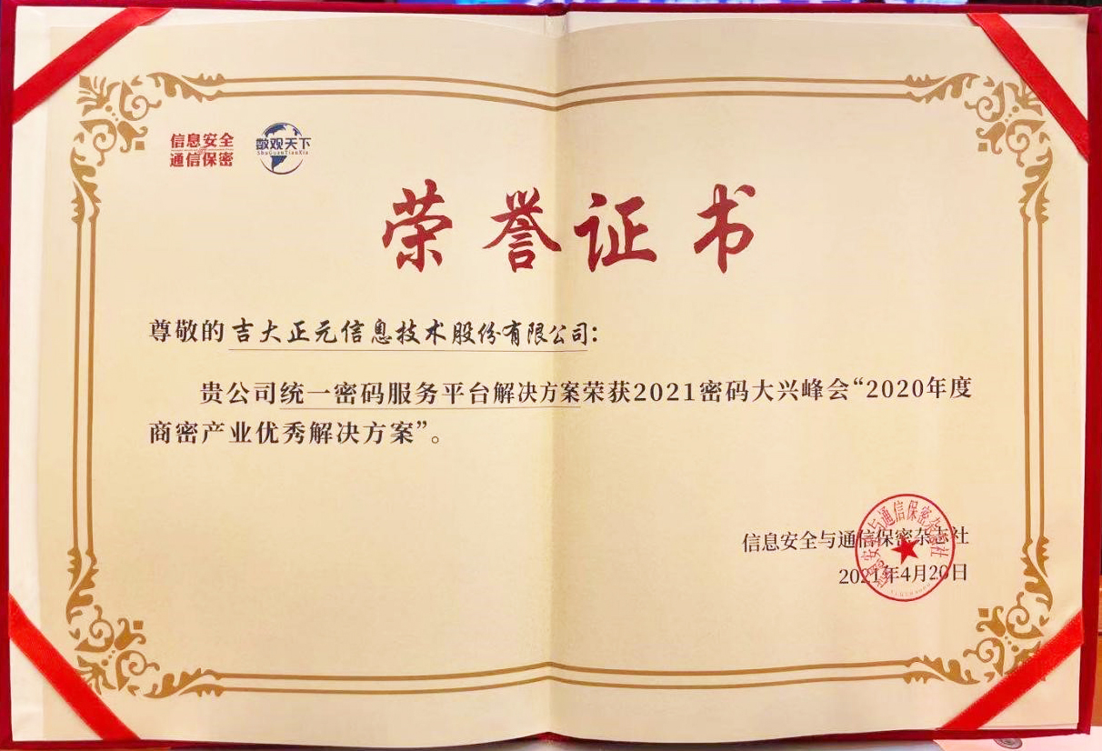 2021年4月20日,由北京市密码管理局、北京市大兴区人民政府、中国电子学会指导,国家新媒体产业基地、信息安全与通信保密杂志社、中关村中安高速密码产业联盟(筹)联合主办的以“因密而安”为主题的密码行业盛会——“2021密码大兴峰会”,在北京国家新媒体产业基地成功举行。长春吉大正元信息技术股份有限公司(以下简称:吉大正元)“统一密码服务平台解决方案”荣获“2020年度商密产业优秀解决方案”。
