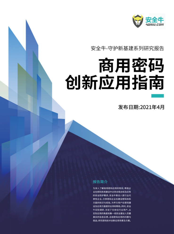 为深入了解商用密码应用的现状,安全牛通过实际访谈大型医疗企业、保险公司、运营商、汽车制造、软件开发等50家企业用户,聘请11位相关领域专家,调研了解企业在开展商用密码建设时存在的问题与挑战,总结整理企业用户的密码需求,历时3个多月撰写了《2021商用密码创新应用指南》。