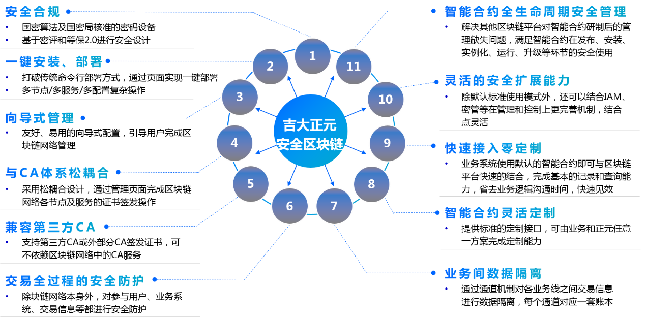 吉大正元在密码领域深耕多年,关注国内外数据安全技术产业发展,积极深化和拓展区块链等新一代密码创新应用与技术发展,基于国产商用密码体系和PKI技术开发研制了吉大正元安全区块链平台,遵循了国家密码管理主管部门核准的算法标准和规范,采用了国家密码管理主管部门核准的密码设备或模块,保证对数据的防篡改、抗抵赖、机密性等需求,提供面向人、系统和节点“三位一体”的安全保障,为各行各业数据安全治理提供“安全、合规”的区块链平台。