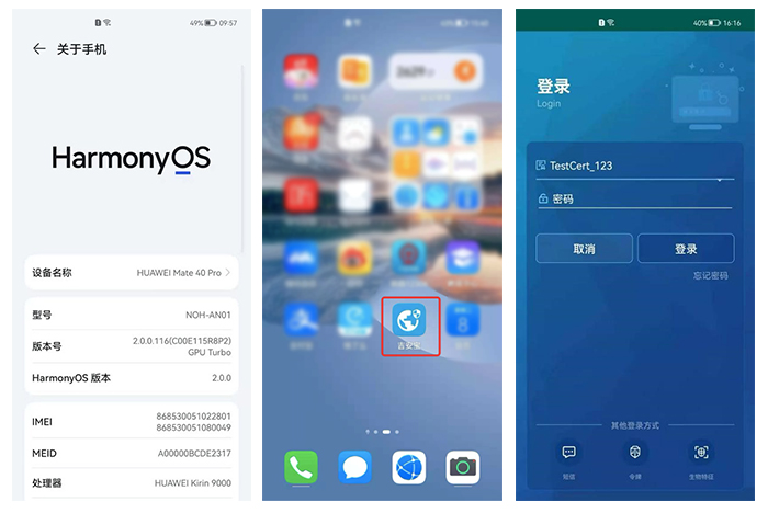 6月2日,华为公司举行线上发布会,对外正式发布鸿蒙操作系统,吉大正元迅速跟进,将移动终端全线产品与鸿蒙操作系统进行适配,已在兼容性、功能性、产品性能、产品运行稳定性等方面完成测试并在客户中正式投入使用。下图展示了吉大正元吉安宝已成功兼容鸿蒙OS系统的具体页面。