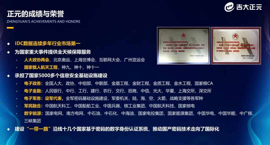 吉大正元产品和方案在金融、政府、能源等领域应用广泛,连续多年在国内信息安全应用领域软件市场占有率第一(来自IDC数据),承建了国家5000多个信息安全基础设施建设,在“一带一路”沿线十几个国家建设基于密码的数字身份认证系统,推动国产密码技术走向了国际化,是信息安全领域龙头企业。