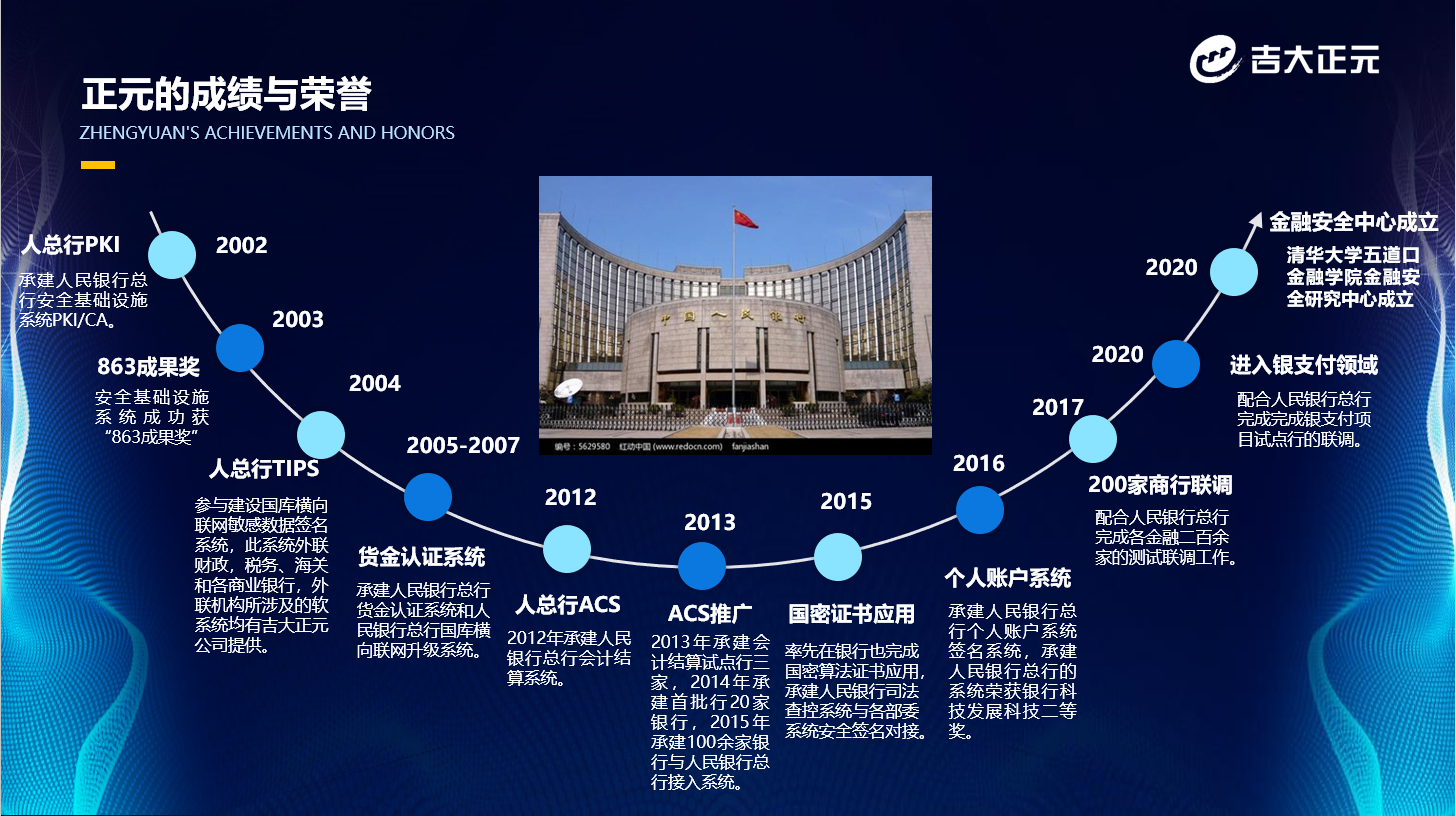 公司一直深耕金融行业,从2002年起承建了人总行PKI系统,经过近20年的服务,持续为TIPS、ACS、个人账号等业务系统提供密码支撑服务,是人行数字化监管的基础设施、安全保障。吉大正元联合清华五道口金融学院成立了金融安全研究中心,致力于打造新形势下符合金融信息化要求的安全保障方案。