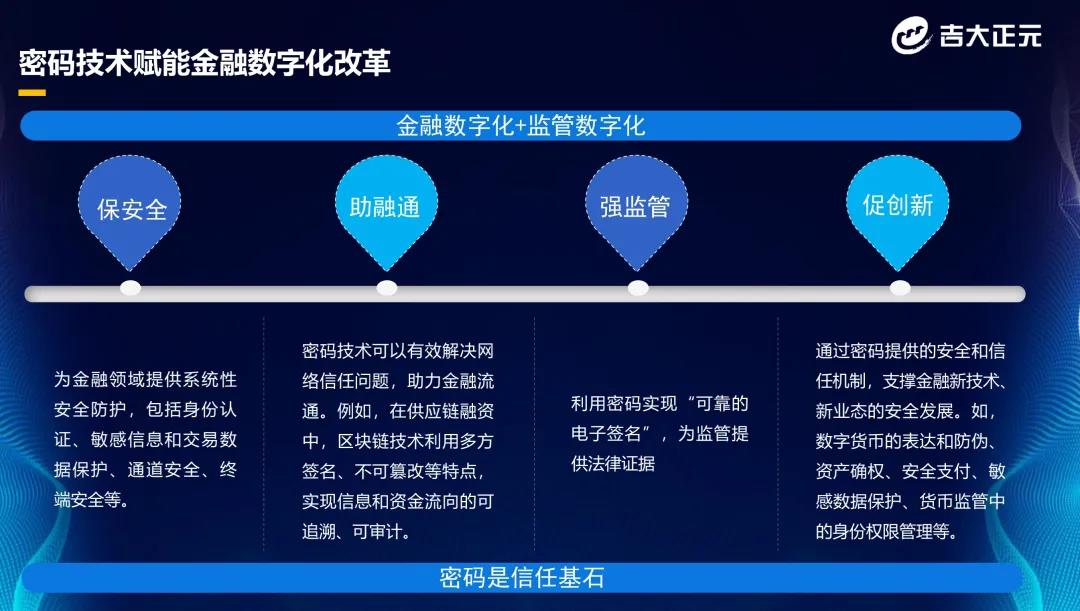 金融行业正处于数字化转型关键时期,密码技术是金融数字化建设的信任基石,通过“保安全”、“助融通”、“强监管”、“促创新”几个方面,促进金融数字化、监管数字化工作的安全、有序开展。