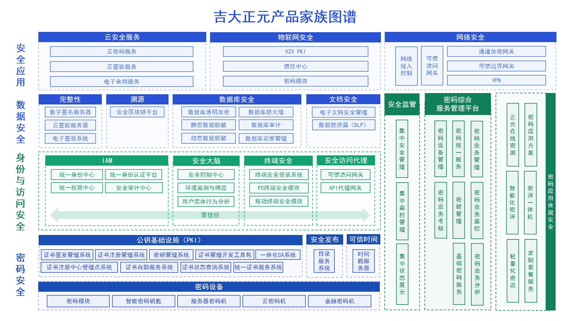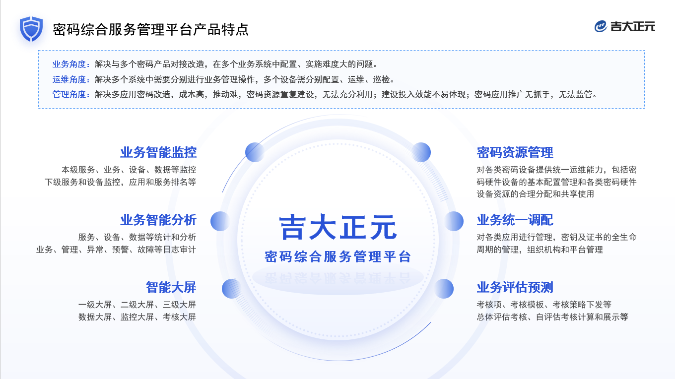 吉大正元密码综合服务管理平台是提供完整密码服务和提供设备、数据等统一监管的技术支撑平台和运营管理支撑平台。密码综合服务管理平台包括密钥管理系统、基础密码服务系统、时间戳服务器、传输加密网关、服务器密码机等,提供密钥统一服务、密码业务管理、密码设备管理、密码业务监控、密码业务分析、密码业务考核等管理服务。