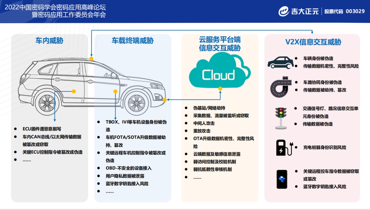 与此同时,将汽车接入互联网也打破了汽车控制系统原有的封闭生态,将互联网的安全风险引入到了汽车网络中,汽车网络成为备受黑客欢迎的攻击目标。车联网安全威胁包括车内的车载终端威胁、云服务平台和人车交互的威胁以及车与各种终端设备交互的威胁。阻止威胁的重要手段是对身份进行识别和对信息通讯提供安全的链路保障。其中,车际安全应用十分广泛。吉大正元推出的“主管机关V2X 可信根管理系统”是在PC5直通模式和LTE-Uu的V2X通信的基础上,使用V2X通信证书来实现车车、车路的高性能安全通信和车辆信息隐私保护。