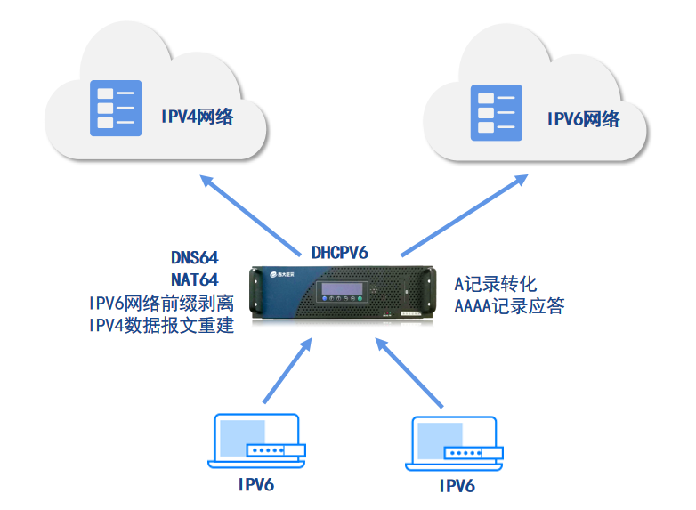 身份认证网关应用端服务系统的多项IPV6支撑能力为用户提供保驾护航,在IPv6网络中,可以作为DNS64网关和NAT64网关,通过DNS64/NAT64技术的协同配合,实现IPv6客户端可以访问仅支持A记录解析的域名网站或应用系统。身份认证网关应用端服务系统还支持DHCPv6和IPv6路由通告技术,可以为IPv6网络设备提供状态化或无状态化的IP地址自动分配方案。