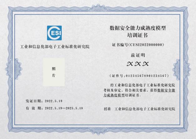 经培训考核,成绩合格的学员将获得由工信部电子工业标准化研究院颁发的“数据安全能力成熟度模型(DSMM)培训证书”。