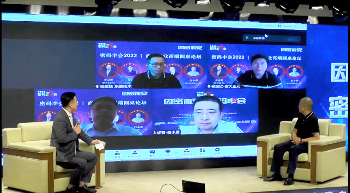 圆桌对话环节,通过对商用密码行业时代背景下,以征途、开荒、承载、加速、挑战进行了深入探讨,吉大正元副总裁张宝欣等嘉宾探讨分享了中国商用密码领域的密码技术实践应用,打通行业壁垒,为行业产业链实践探索带来了全新思路,指明了方向。