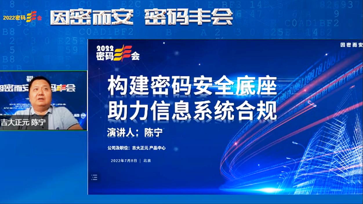 吉大正元产品中心总经理陈宁在大会上做了题为《构建密码安全底座 助力信息系统合规》的主题分享,从合规背景与要求、合规驱动下的密码应用需求、密码服务平台解决方案和典型案例等多重角度进行全方位解读。