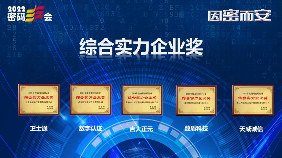 本届大会举行了2021年度商用密码行业年度颁奖盛典,吉大正元凭借优秀的产品和解决方案,以及2021年度公司的优秀表现,赢得“综合实力企业奖”。