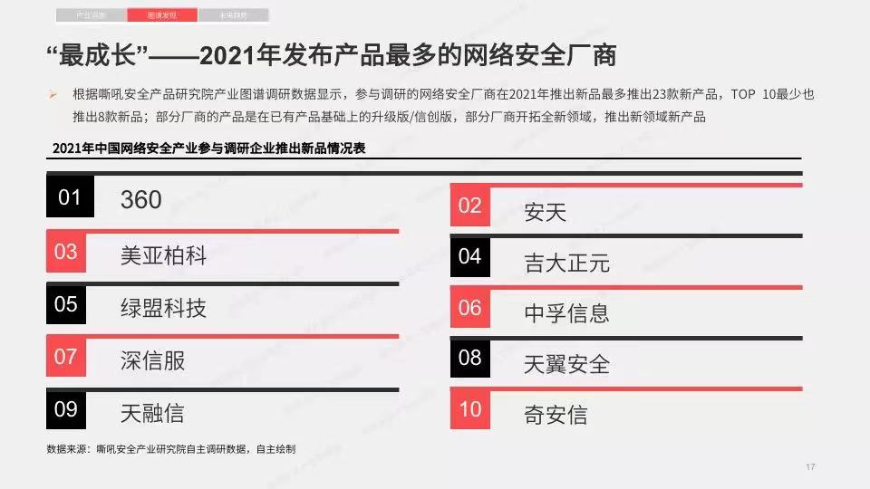 在本次嘶吼研究院对2022网络安全产业图谱研究报告的解读中,评选出了2021年度发布产品最多的网络安全厂商。在参与调研的厂商中,有46%的厂商在2021年有创新产品推出,而吉大正元凭借在近两年上市前后的集中布局与发力,在2021年度推出新产品的数量名列前茅,跻身年度“最成长”厂商阵营,这是公司多年来技术创新、厚积薄发的最佳例证。