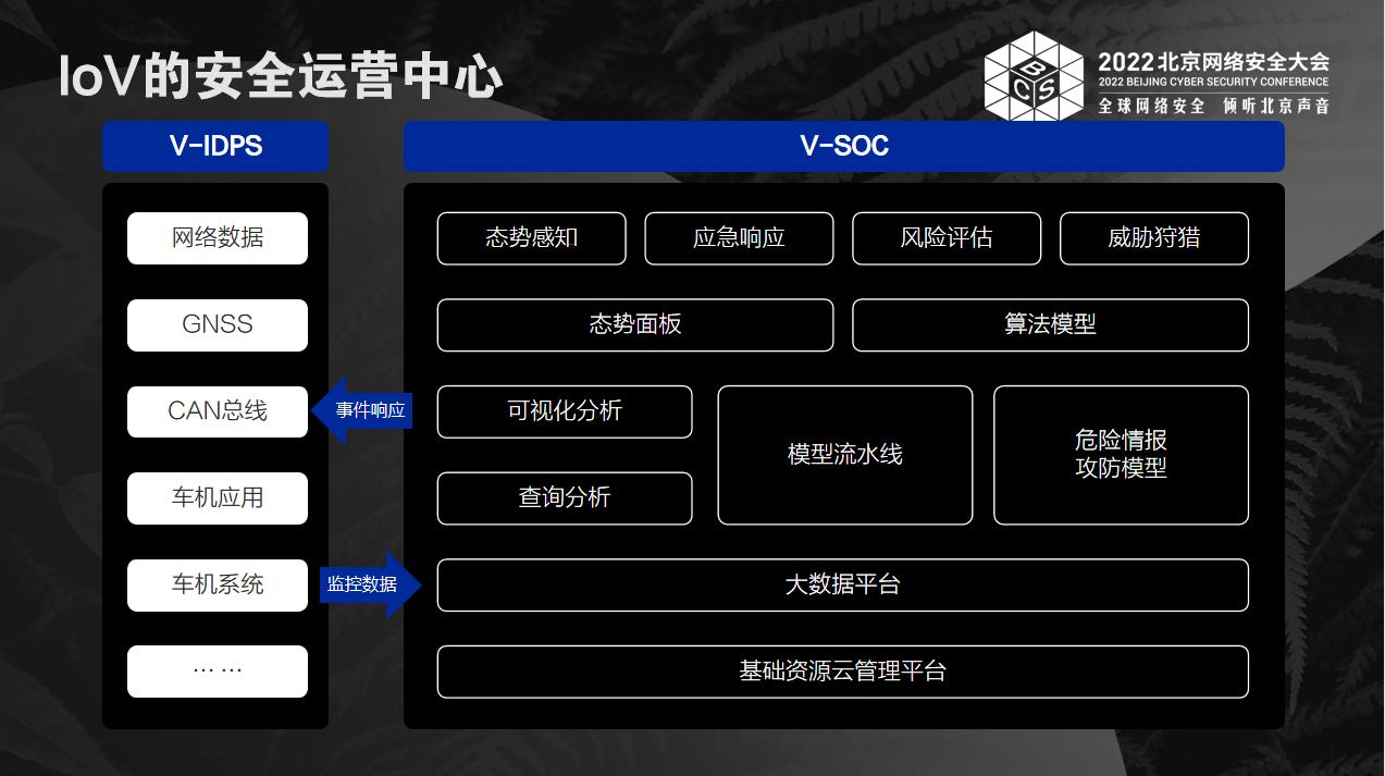 吉大正元打造了从车云联动车联网的安全检测与运营平台,在端侧充分强化各种事件数据的完整性,云端运营平台对数据收集和分析,反馈事件响应,做到安全运营。通过底层的基础技术资源云管理平台、大数据平台、以及在其之上构建大数据方面查询和可视化分析引擎以及模型流水线,威胁情报、攻防模型,最终在其上再构建高层的安全运营能力:比如态势感知、应急响应、风险评估、威胁狩猎等。