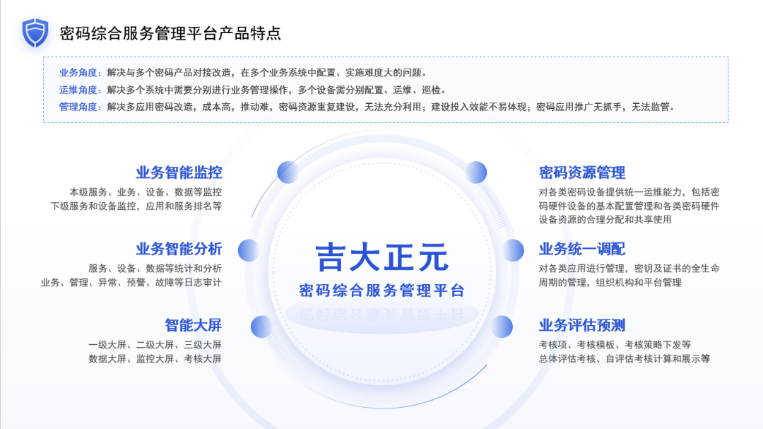 吉大正元密码综合服务管理平台是将完整密码服务和设备、数据等进行统一监管的技术支撑平台和运营管理支撑平台。密码综合服务管理平台包括密钥管理系统、基础密码服务系统、时间戳服务器、传输加密网关、服务器密码机等,提供密钥统一服务、密码业务管理、密码设备管理、密码业务监控、密码业务分析、密码业务考核等管理服务。