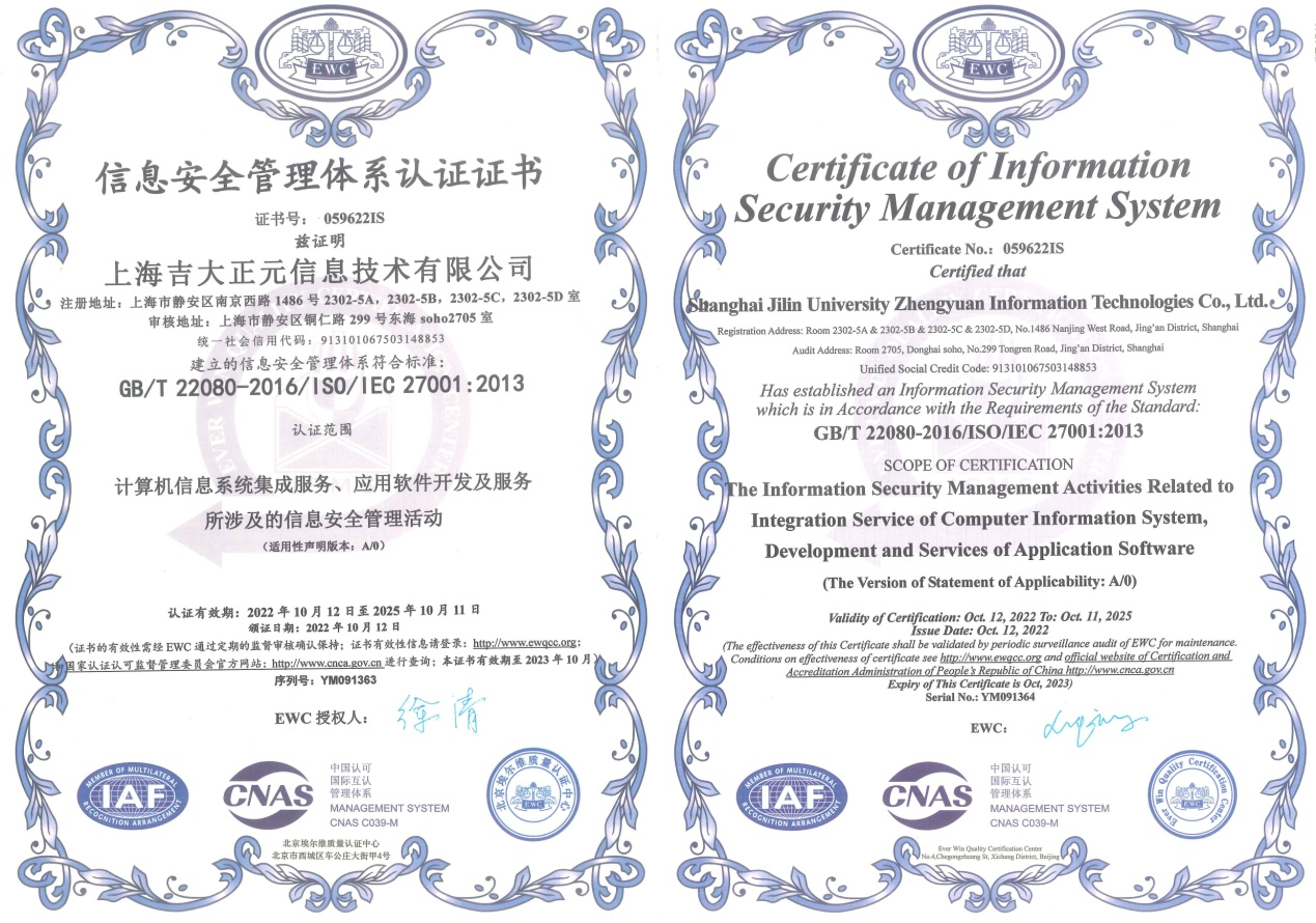上海吉大正元信息技术有限公司于2022年10月通过ISO 27001信息安全管理体系、ISO20000信息技术服务管理体系和ISO9001质量管理体系的标准化审核,经相关权威机构评定,被授予ISO 27001信息安全管理体系、ISO20000信息技术服务管理体系和ISO9001质量管理体系认证证书,标志着上海吉大正元在信息安全管理、信息技术服务管理体系以及质量管理体系上全面达到了国际认可标准!