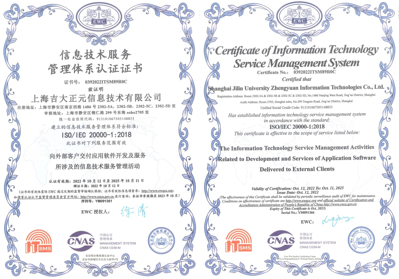 此次通过ISO20000信息技术服务管理体系认证,标志着上海吉大正元在服务流程、客户服务能力等方面与国际接轨,有能力为更多客户提供有效的信息技术服务,为公司在今后的市场竞争中提供有力支持。未来,上海吉大正元将依照《信息技术服务管理体系》的要求,遵循“提升服务意识,完善服务技术,创造服务价值,追求卓越成效,实现品质共赢”的服务方针,持续提升服务质量和管理水平,为实现与客户共赢发展而不断努力。