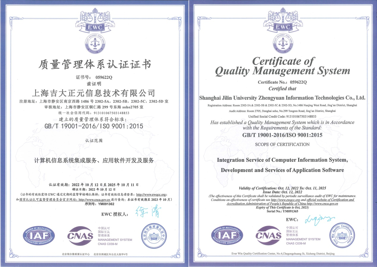 自上海吉大正元成立以来,公司管理层高度重视质量管理体系建设,各业务中心均认真贯彻落实ISO9001质量管理体系要求。ISO9001质量管理体系认证的通过,充分展现了上海吉大正元在规范公司业务流程、有效管控风险方面已初步形成标准化经营和规范化管理的模式。这将有助于我们不断提升质量管理水平,在市场竞争中树立良好的企业形象和信誉,对未来的长远发展具有重要意义!