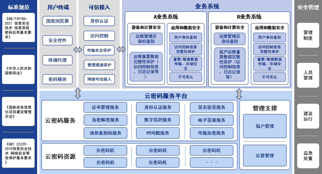 吉大正元政务云密码应用方案是以密码技术为核心,以云密码机、签名验签服务器、身份认证网关等密码产品为支撑,通过密码服务平台提供统一的安全密码服务,构建面向云上业务系统的密码安全支撑体系,实现针对物理与环境、网络和通信、设备和计算、应用和数据等多个安全层面的密码应用保护,同时建立密钥管理和安全管理制度,从制度上规避密码安全风险。