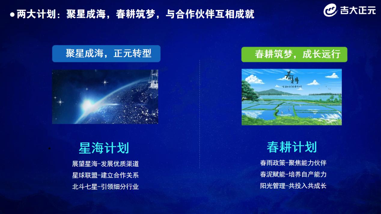 渠道大会上发布了两大渠道发展计划,分别是星海计划和春耕计划。星海计划:聚焦7大行业,如政府、财政、军队、金融、军工、公安、能源等,联合一些战略的ISV资源,包括基于行业分析和双方信息化产业的耦合,共同打造业界的行业标杆,与业界的解决方案标杆产品,进行快速的案例推广,进行从1到N的规模复制。春耕计划:主要是针对二级市场,包括中小市场,希望越来越多的有能力、有团队、有意愿的合作伙伴加入吉大正元,携手共进,合作共赢,共创整个网络安全的一个新市场。