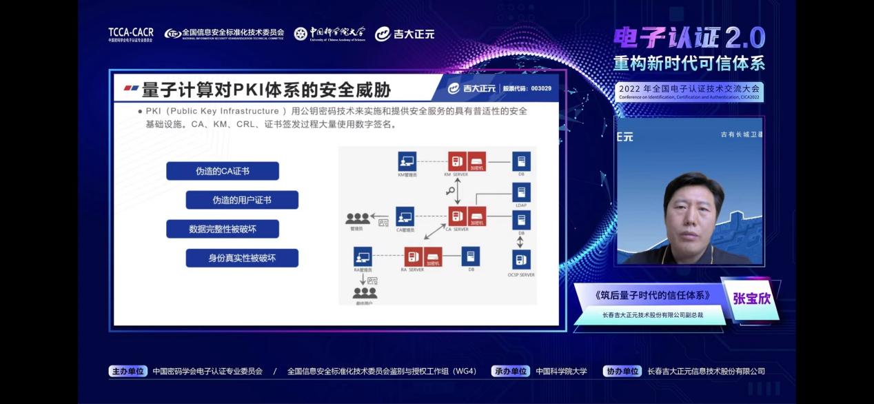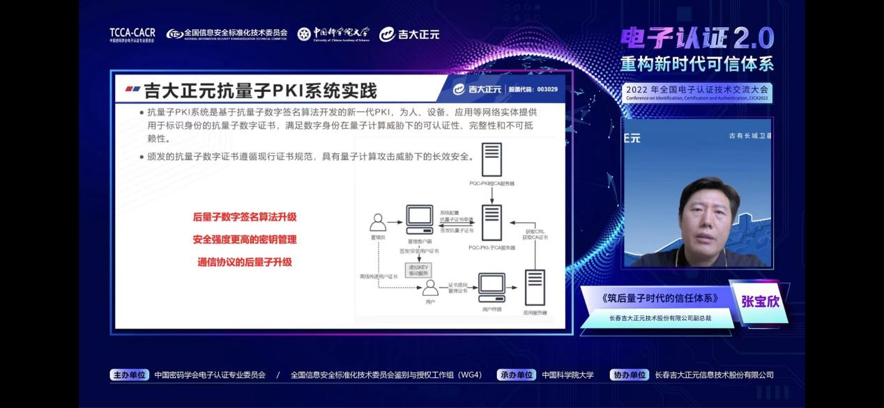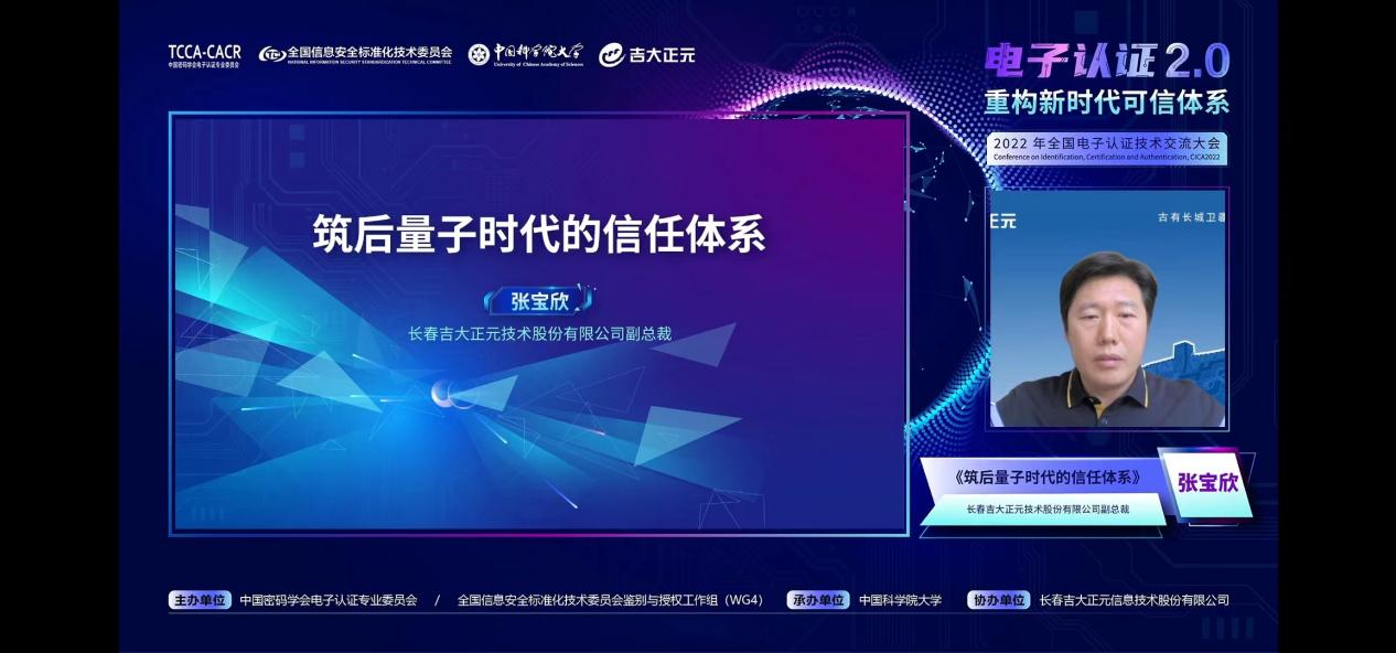 12月16日,由中国密码学会电子认证专业委员会、全国信息安全标准化技术委员会鉴别与授权工作组(WG4)主办,中国科学院大学承办,长春吉大正元信息技术股份有限公司(简称:吉大正元 股票代码:003029)协办的“2022年全国电子认证技术交流大会”于线上举行,数十位电子认证专家围绕电子认证技术发展进行线上研讨,中国科学院大学密码学院院长荆继武主持本次大会,中国工程院院士邬贺铨、公安部第一研究所主任杨林、吉大正元公司副总裁张宝欣等专家做主题演讲。