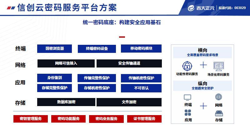 在信创体系与密码技术融合应用案例方面,吉大正元结合市场需求及自身优势研制了信创环境密评密改应用方案、政务云密码应用方案、电子档案密码应用方案及密码安全建设和运营服务方案,支撑信创体系中的商用密码无缝应用。