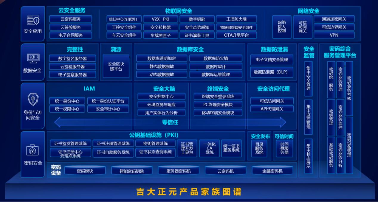 近年来,吉大正元立足优势技术不断创新,打造了以密码为核心的网络安全技术实力,积极开展密码技术、网络安全、云安全、信创安全、区块链、人工智能、量子计算等领域的前沿技术研究,不断提升产品技术竞争力和公司整体实力,这也让公司从传统单一系列优势转变为全产业链的竞争优势,不断拓展并深耕身份与信任、数据安全、物联网安全、工控安全、云安全等大安全领域,不断推出新的产品和解决方案,打造密码安全、身份与信任体系、数据安全、系统安全、网络安全、云安全、应用安全、业务安全等泛安全产品体系,并面向政府、金融、能源、电信等众多行业为用户提供系统安全建设、应用安全建设、数据安全建设等多层次、全方位的整体解决方案和集成服务,提供关键的安全支撑与保障。