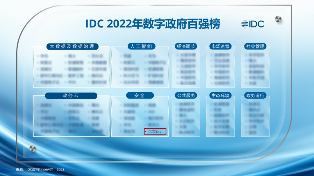 近日,权威市场研究机构IDC梳理并发布了数字政府领域领先的技术供应商榜单,暨IDC 2022年数字政府百强榜,该榜单根据2022年政府行业技术提供商的市场能力及市场份额等维度进行综合评估,其涵盖的技术领域包括政务应用、大数据及数据治理、人工智能、政务云、安全等十个模块。作为中国政府行业 IT 安全软件领域优选品牌的吉大正元,本次再次入选数字政府百强安全模块。