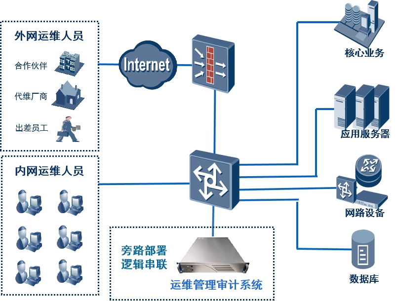 结合ITIL、ITSM、IT 内控、SOX法案\COBIT 法规、信息安全等级保护、密评合规性及IT运维管理要求,专注于网络信息安全领域的吉大正元,综合多年IT运维管理建设经验和业界信息安全建设的基础上,在不更改原有网络拓扑结构、不影响服务器的业务数据流、不需要在被保护服务器和终端上安装任何Agent的情况下,满足用户对企业“人机”交互、企业“应用”交付的集中管理、集中认证、集中控制、集中审计等一系列安全需求。