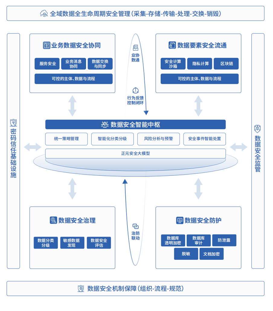 新近推出的“正元数据安全港”正是以”昆仑“大模型作为智能中枢,首先摆脱了数据安全治理领域大量依靠人工、工程量巨大的固有顽疾,高效精准地多模态全结构数据的精准定密/分类分级;同时有机融入丰富的领域知识,大大提高了数据安全风险评估服务的自动化程度与水平;并且可通过内外部数据的监测情况,不断智能调整模型和策略,实现数据安全一站式防护。