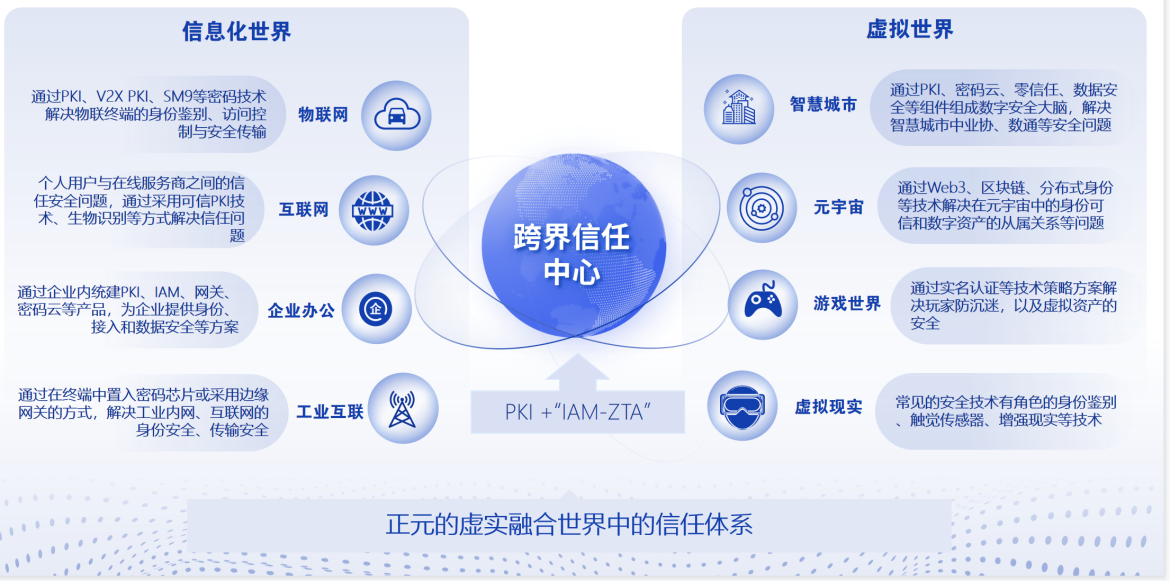 正元虚实融合的“跨界信任中心”正围绕这套数字世界观的关键核心部分:“数字信任”,无论是人与人、人与组织、人与设备还是未来万物互联时代的全面联动,还是从此映射而来的虚拟世界中信任、资产、关系、交易等各个环节,都依赖于全面且安全的数字信任体系,只有构建了数字世界的信任基石,才能将虚拟数字世界勾勒得更加完整牢固。