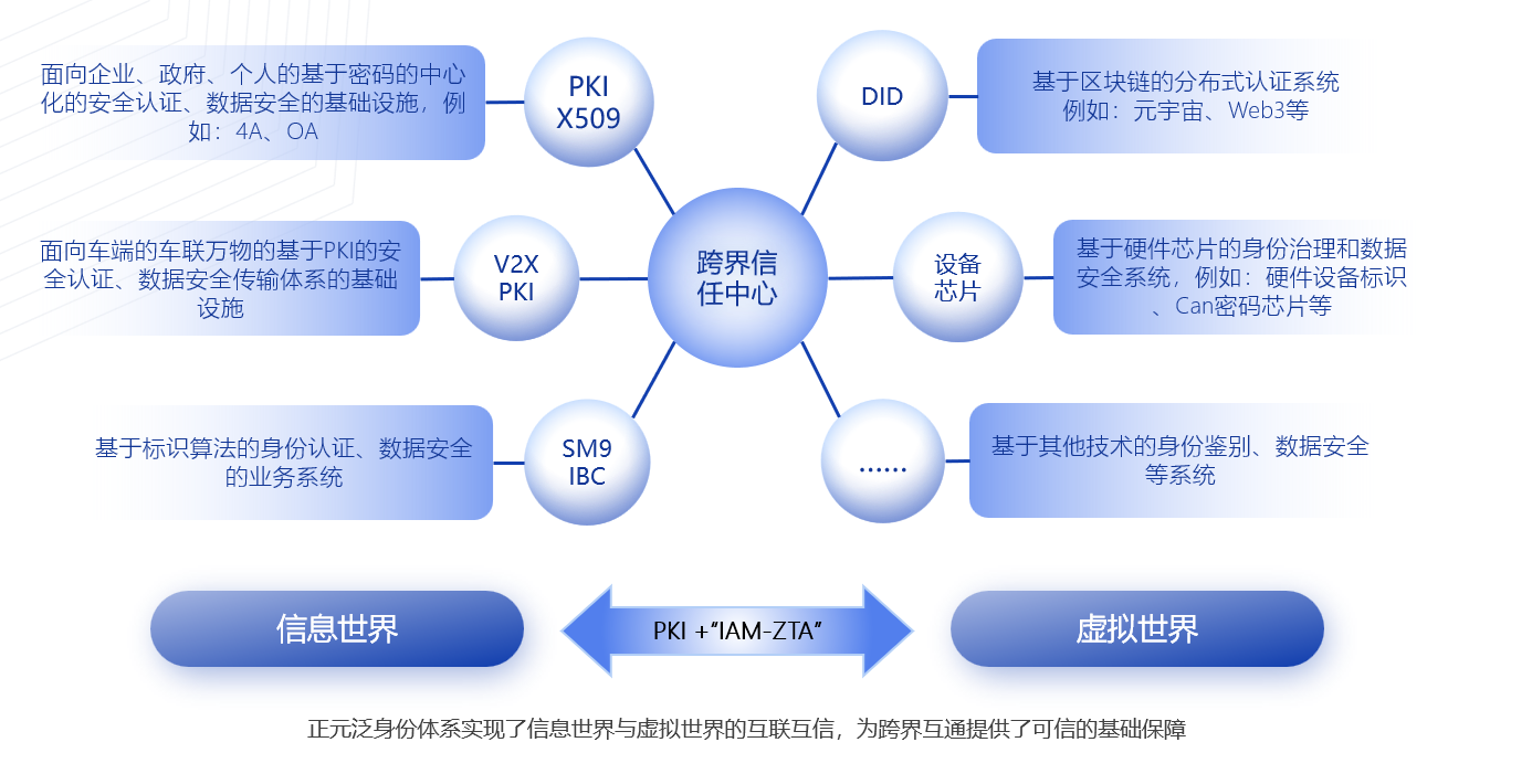 IBC、分布式认证系统DID、基于硬件芯片的身份治理与数据安全系统,以及基于其他技术的身份鉴别、数据安全系统,实现这些身份信任体系在数字世界的互信、互认与互通,构筑起数字世界“数字身份”统一的安全桥梁,为跨界互通提供了简单、快捷、融合的基础保障。