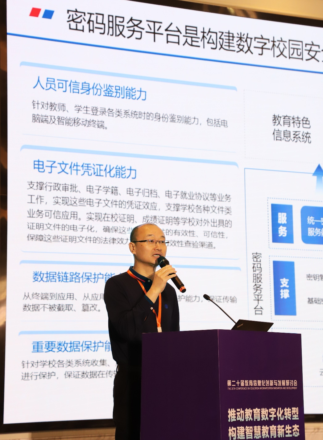 在“密码构筑教育数字化安全底座,赋能教育高质量发展”主题论坛上,吉大正元执行总裁田景成发表了题为《锻造数字教育的“元”安全铠甲》的主旨演讲。