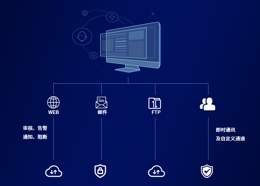 产品支持基于HTTP(S)传输方式、邮件(SMTP、WEBMAIL)、文件传输(FTP)以及即时通讯等途径的外泄防护。同时支持基于HTTP协议的扩展应用,例如QQ文件传输、钉钉、WEB邮箱、云盘、微博等应用,能够精准提取包括微软OFFICE系列、金山WPS、PDF文档等常用文件的内容信息,用于敏感数据识别与检测。