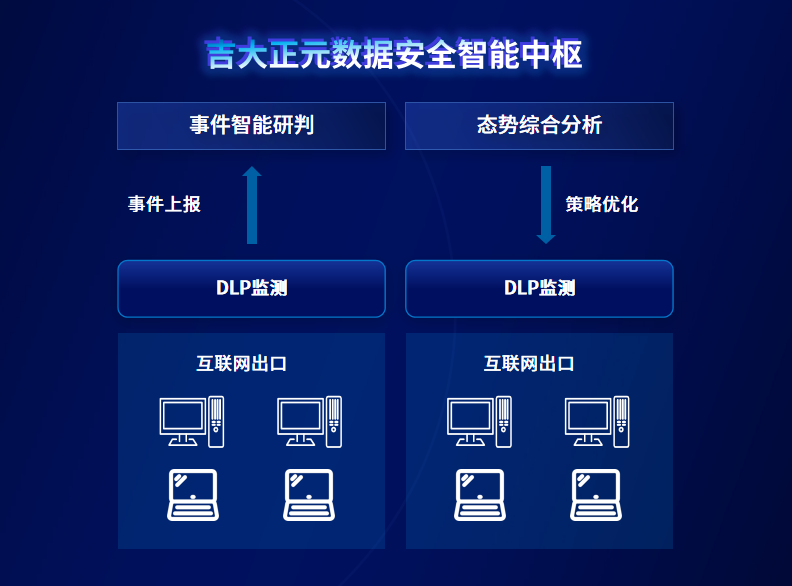 JIT-DLP能够实现与吉大正元数据安全智能中枢系统无缝集成,并实时上报事件告警、安全日志等信息,数据安全智能中枢一方面能够结合其他关联信息对安全、告警、事件和日志进行智能研判、挖掘、下探,发现风险事件,另一方面,也能改进JIT-DLP安全策略,使其更加精准、高效。