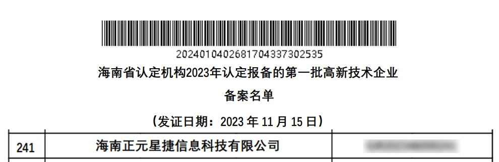 近日,全国高新技术企业认定管理工作领导小组办公室对外公布海南省认定机构2023年认定报备的第一批高新技术企业进行备案的公告名单,长春吉大正元信息技术股份有限公司(以下简称:吉大正元 股票代码:003029)全资子公司海南正元星捷信息科技有限公司(以下简称海南正元星捷)成功上榜,通过本轮国家高新技术企业认定。