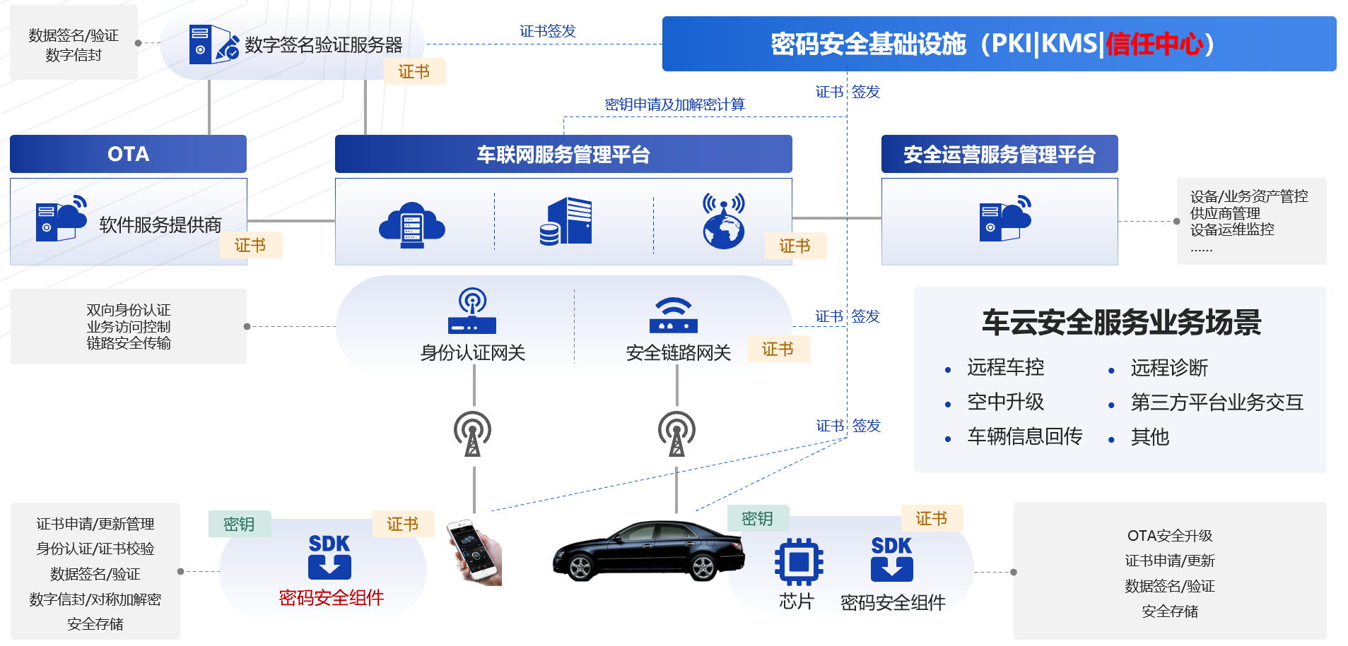 通过引入数字证书应用体系,能够解决车联网通讯中各参与方的身份真实性,数据传输受到网络安全威胁,采用传统账号管理安全性低等一系列问题。通过为车联网设备、移动设备等签发标识其身份的数字证书以实现更高强度的身份识别和校验机制。再进一步围绕数字证书应用,智能网联车辆与云端业务系统间建立安全通信链路,对所传输的业务数据进行签名、加密等安全措施,提升智能网联体系整体安全性。