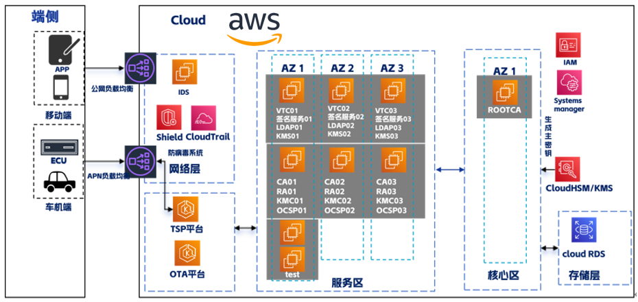 某某车企针对境外针对只能网联汽车数据安全法规政策要求,需要符合联合国世界车辆法规协调论坛(简称为UN/WP.29)发布的三项关于智能网联汽车的重要法规R155/R156/R157,即信息安全(Cybersecurity)/软件升级(Software updates)/自动车道保持系统(ALKS)、等相关法规政策合规的前提下,在出口车辆所在境外地区建立了安全基础设施,其中包含了车联网信任中心、KMC、签名服务器、LDAP、OCSP、KMS、根CA、二级CA、RA等子系统,为海外车辆提供安全可靠的智能网联服务, 安全基础设施系统部署架构图如下。