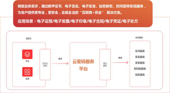 云密码服务平台已经广泛应用于金融、保险、政务、教育、电商、旅游、物流、财税、医疗等行业,为电子合同、电子印章、电子保单、电子发票、电子证照、电子病历、电子处方提供安全可靠、合法合规的密码服务,保障电子数据的真实性、合法性、关联性和完整性。