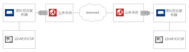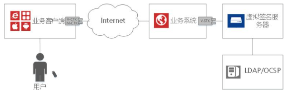 云签验服务器支持嵌入B/S 或 C/S 系统中,业务系统客户端调用数字签名客户端, 保证了用户作为单一个体,身份的正确性和不可否认性。业务系统服务器端调用虚拟签名服务器的服务器接口,充分发挥了虚拟签名服务器证书验证的功能优势和并发处理的性能优势。