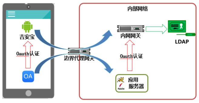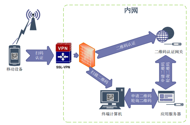 应用系统展示从身份认证网关获取的二维码,手机端扫描二维码,通过边界设备连接到内网的二维码认证网关进行身份认证。