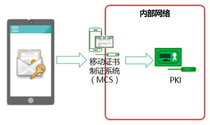 部署方式1、移动证书制证系统MCS 部署到内网边界区域, 移动端通过互联网直接连接 MCS 进行证书申请。