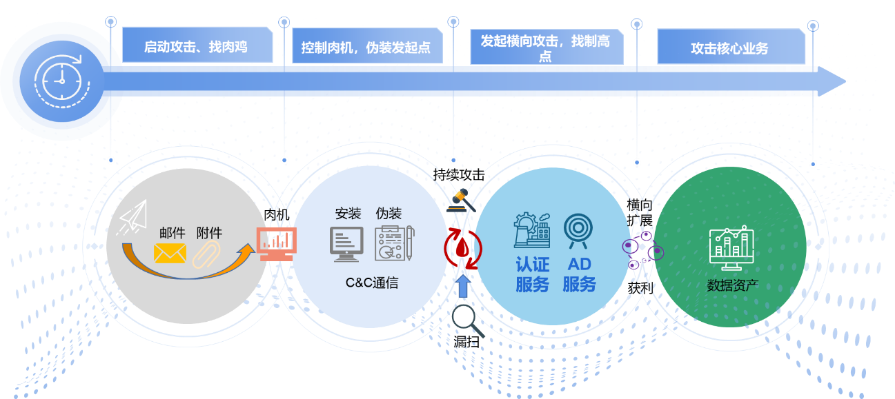从发起攻击->寻找跳板机->伪装(C&C)->持续攻击(AD域、认证服务)->横向扩展(获利)一系列的操作最终达到获取具有经济价值的大量核心数据资产。而红队在整个攻击链中充分的利用各种先进的计算机技术配合社会工程学完美的攻破了一个又一个看起来安全的堡垒。