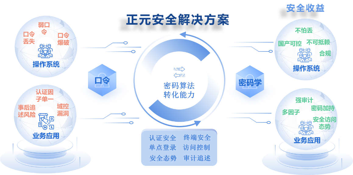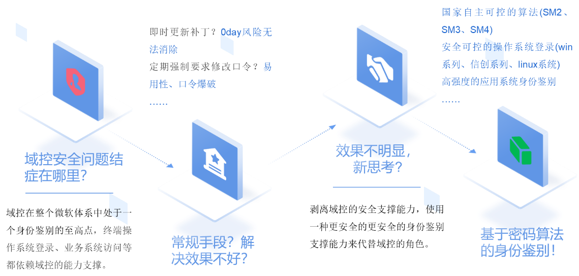 吉大正元DIS AD域安全解决方案通过接管原始操作系统、业务系统的身份认证过程,剥离原始域账号、密码在域内的安全支撑能力,充分利用国产密码技术的密码学特性,实现操作系统身份、业务系统身份的不可伪造、不可抵赖,采取双因素机制解决密码丢失问题,从根本上解决AD域安全问题。