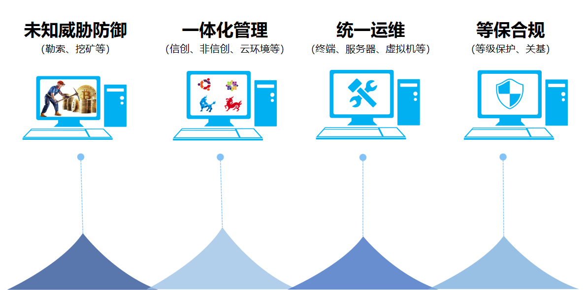 系统建立统一管理的终端安全整体防护体系,有组织有计划地监测和分析终端安全状态,统一配置终端安全策略,提供终端的安全保障能力,确保终端系统正常、高效的运行彻底解决终端安全威胁的全生命周期管理,包括事前预警防范、事中应急处置、事后追责溯源,完成终端安全威胁闭环。