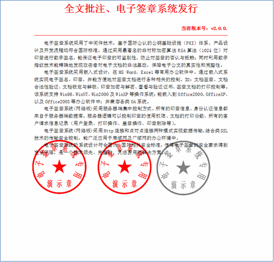 功能特点电子签章系统由签章客户端、印章服务器、USB key三个模块组成。 签章客户端:支持文档盖章、手写签名、文档验证、锁定文档、签章校验、支持Word .Excel. WPS系统; 签章服务端:日志的管理;印模申请、审批;印章申请、审批、制作、授权、吊销; USB key:存放用户的数字证书。